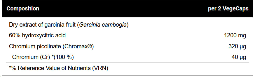 dry extract of garcinia fruit (Garcinia cambogia), thickener (capsule): hydroxypropyl methylcellulose, bulking agent: microcrystalline cellulose, anti-caking agents: silicon dioxide and talc, and Chromax®: chromium picolinate